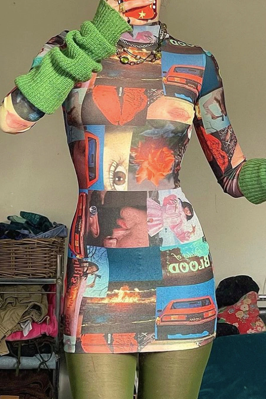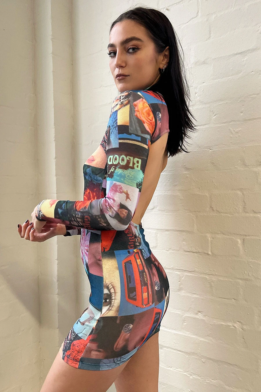 Collage Print Mesh Long Sleeve Bodycon Dress