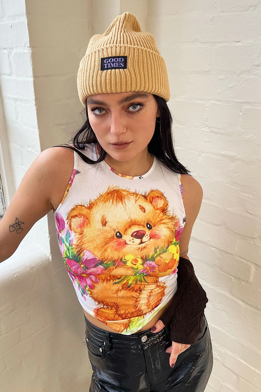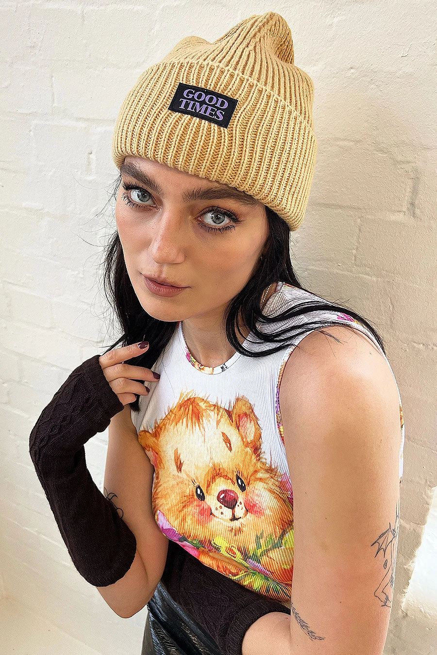 Women’s Beanie with ‘good times’ badge detail.